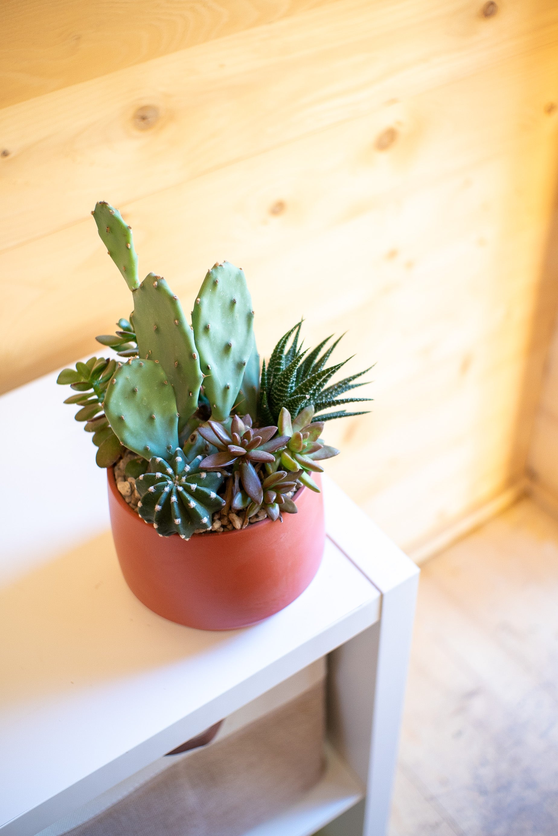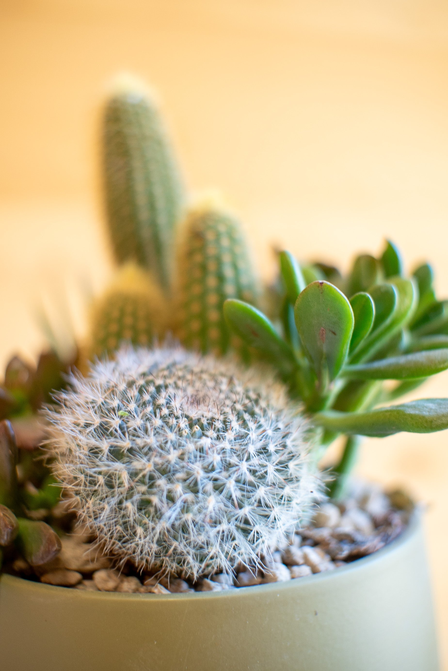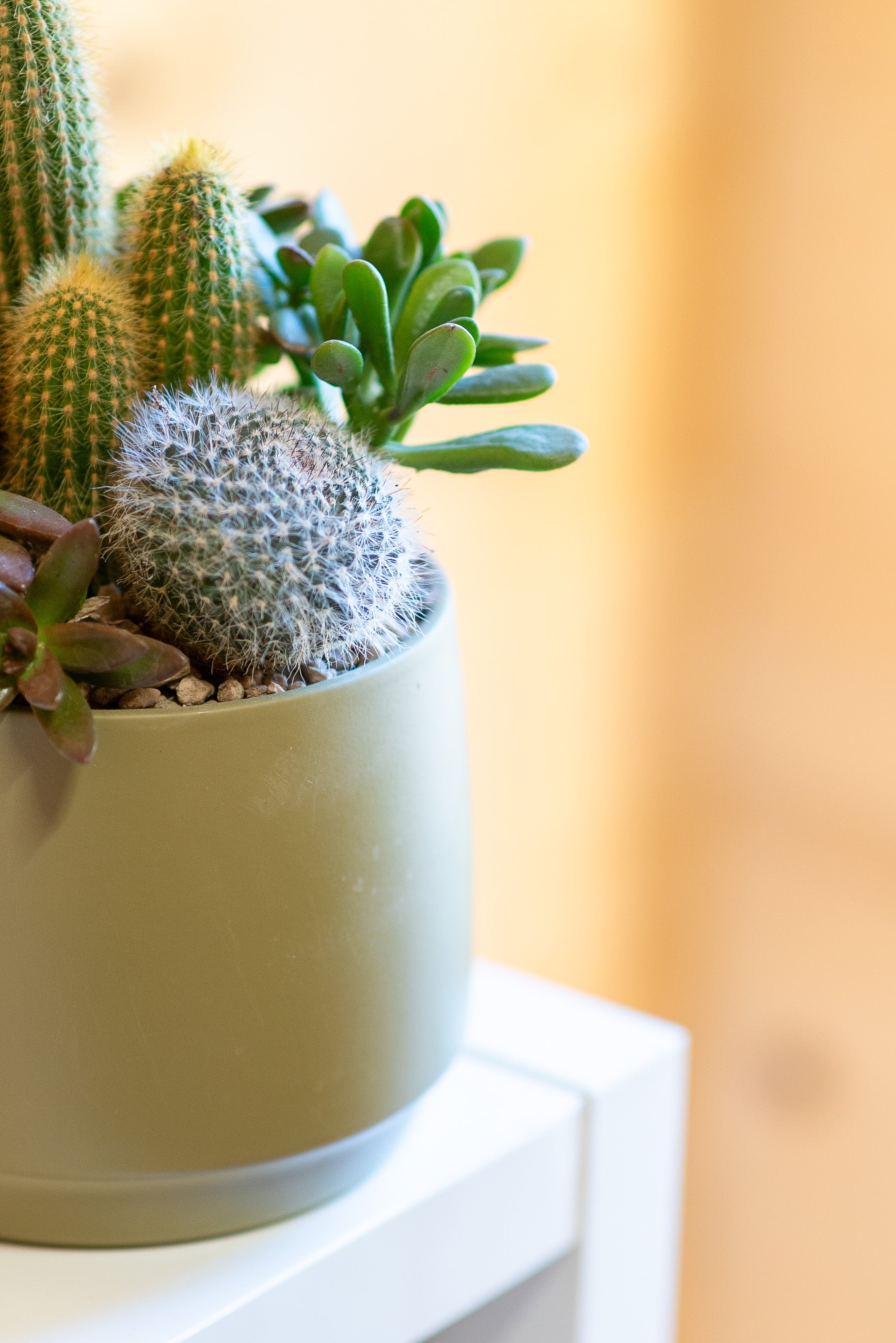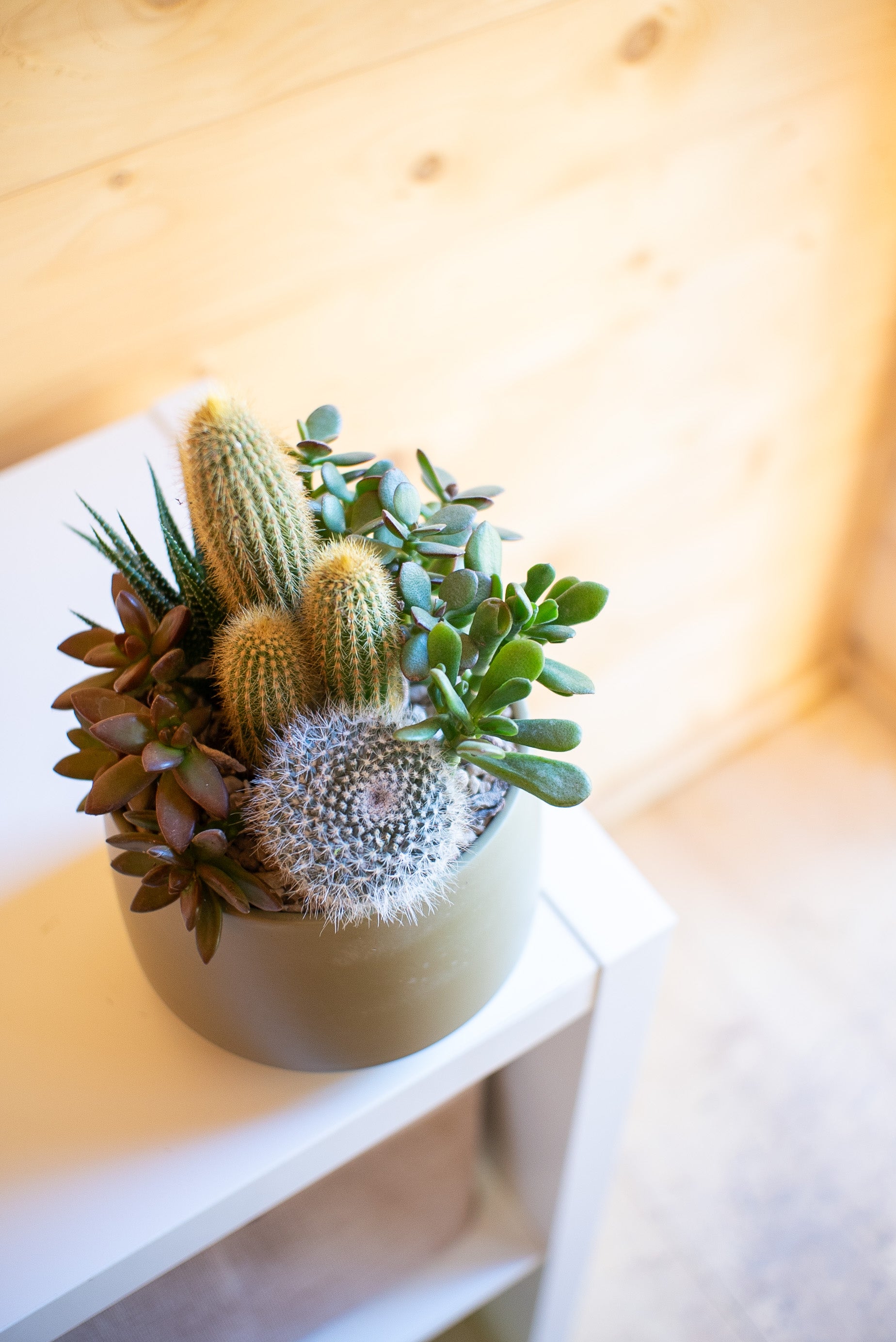 Le composizioni di piante grasse sono create combinando diverse specie di succulente, originarie di deserti e zone aride di tutto il mondo. Dalla famiglia dei cactus alle crassulacee, ogni pianta ha una storia evolutiva unica, legata alla resistenza a condizioni estreme.