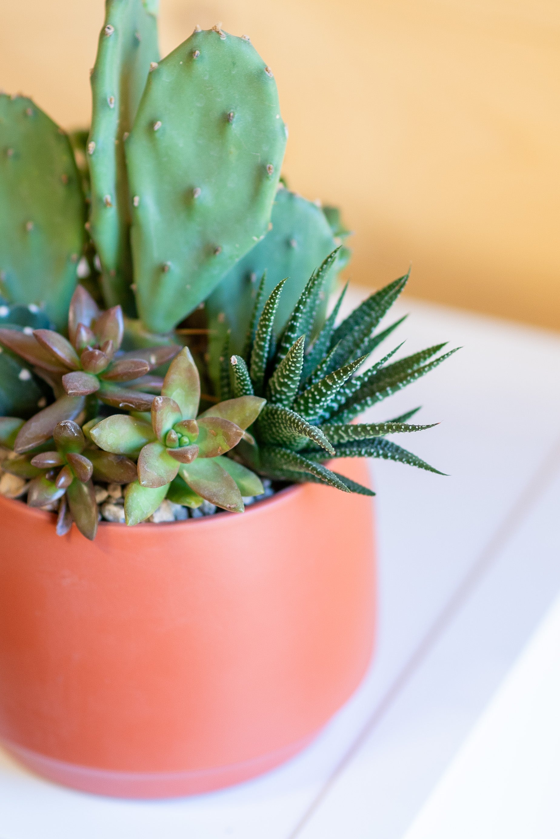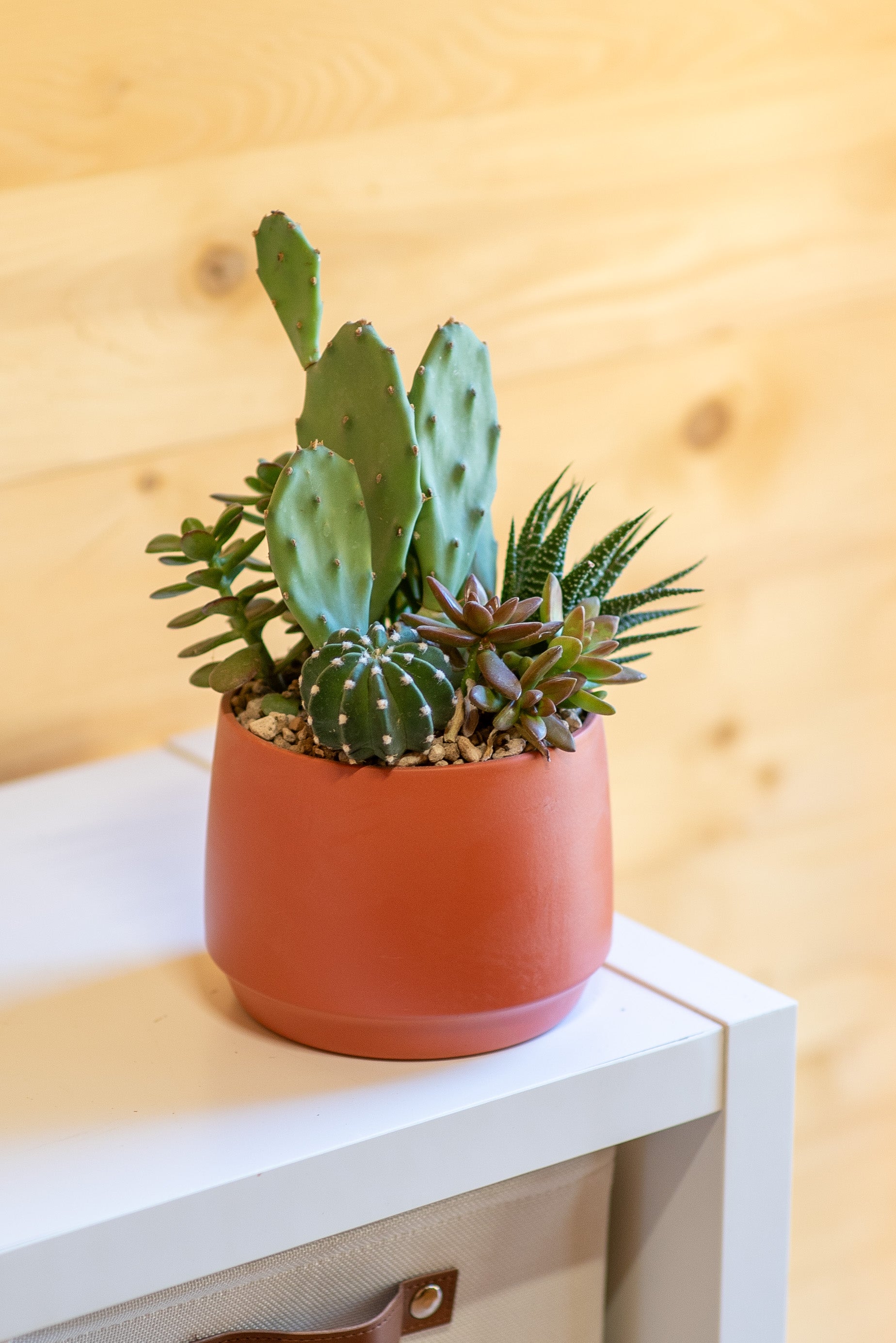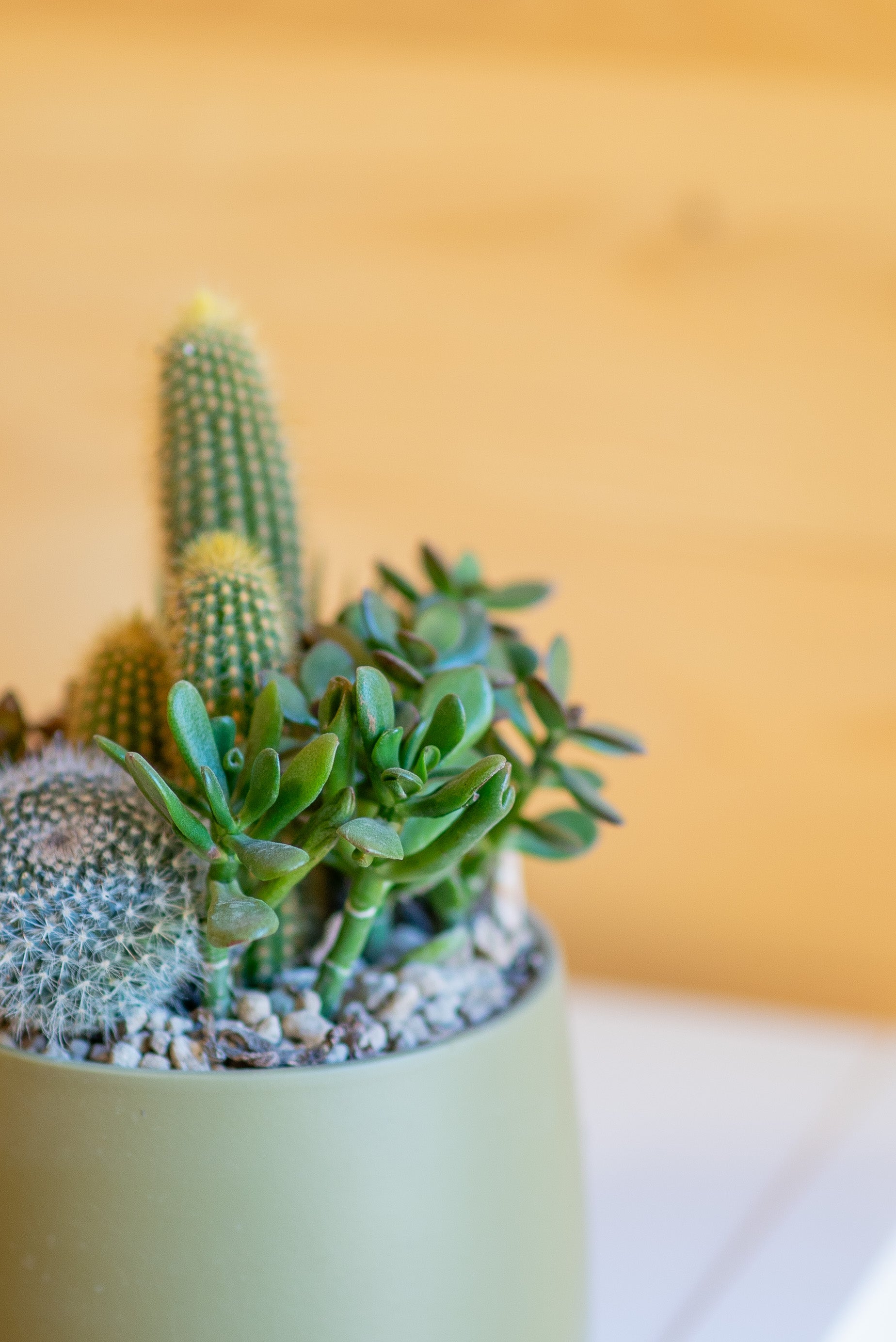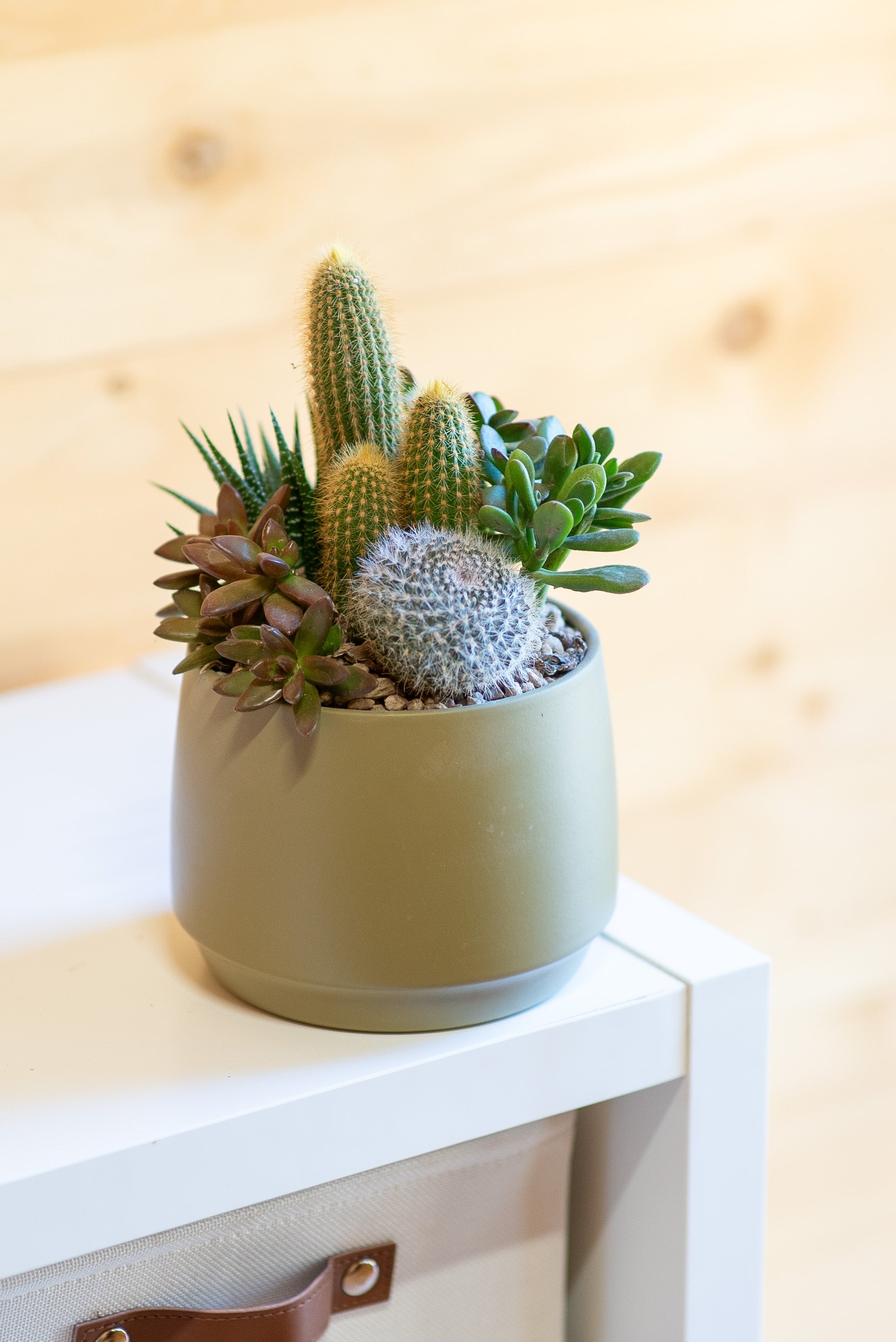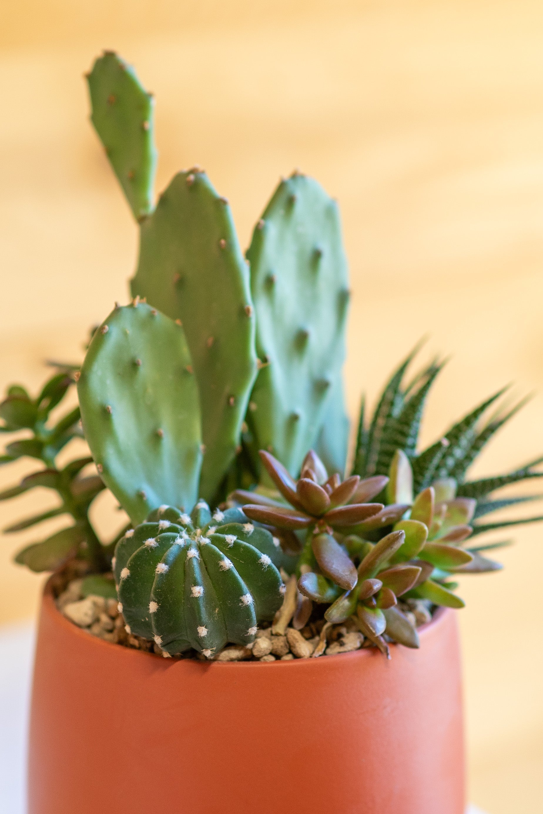 Le composizioni di piante grasse sono create combinando diverse specie di succulente, originarie di deserti e zone aride di tutto il mondo. Dalla famiglia dei cactus alle crassulacee, ogni pianta ha una storia evolutiva unica, legata alla resistenza a condizioni estreme.