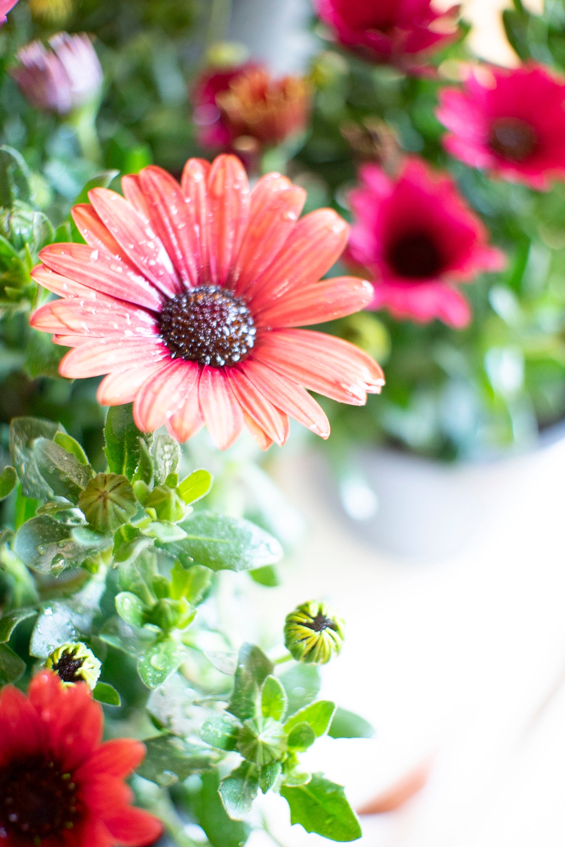 La Dimorfoteca è una pianta erbacea perenne, che in climi freddi può essere coltivata come annuale. Presenta fusti ramificati e foglie lanceolate o dentellate di colore verde intenso. Il suo punto di forza sono i fiori a forma di margherita, che variano di colore dal bianco al viola, dal giallo all’arancione, spesso con un cuore scuro che crea un bellissimo contrasto cromatico. È una pianta cespugliosa che può raggiungere un’altezza di 30-50 cm e si espande facilmente, rendendola ideale per aiuole e bordure.