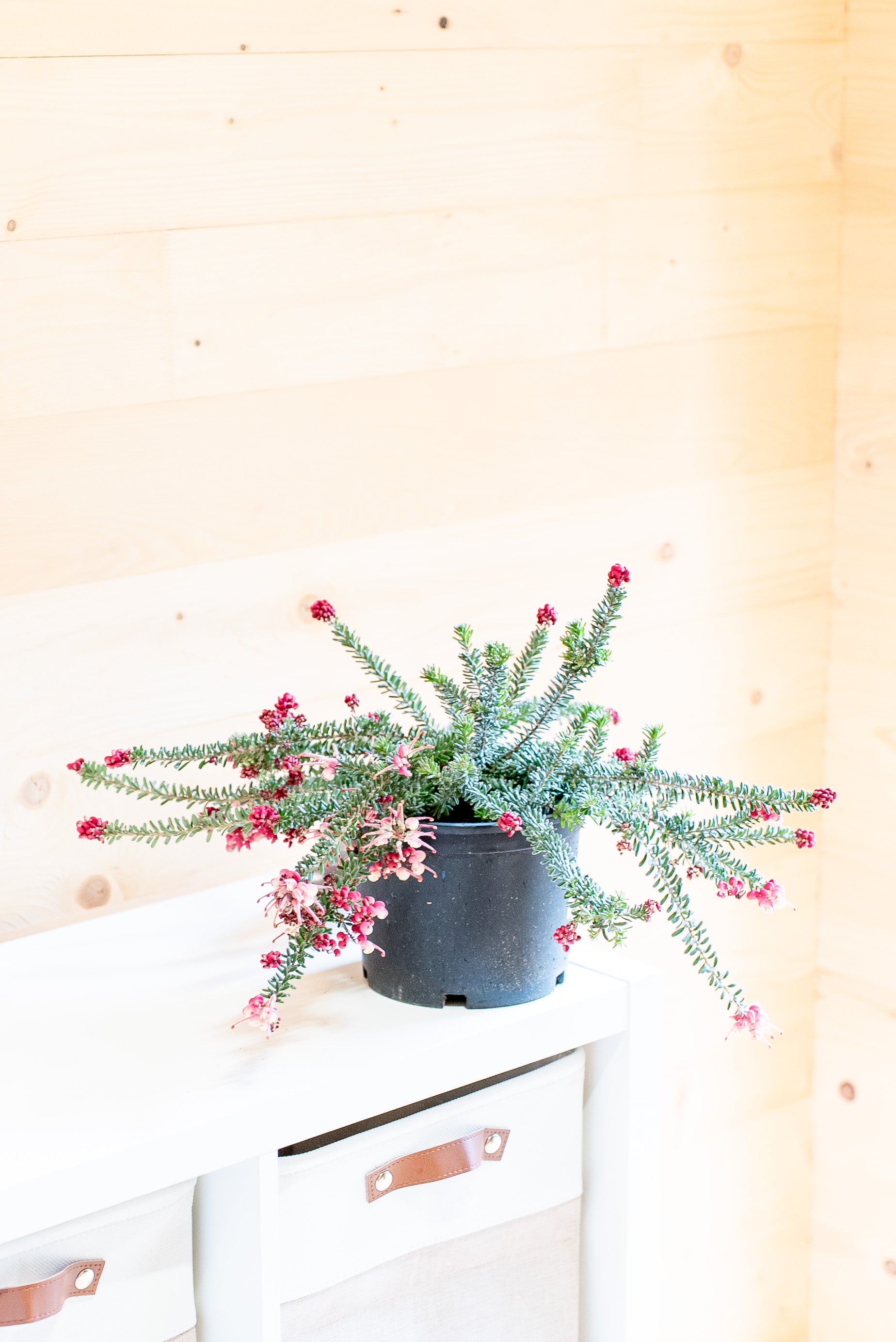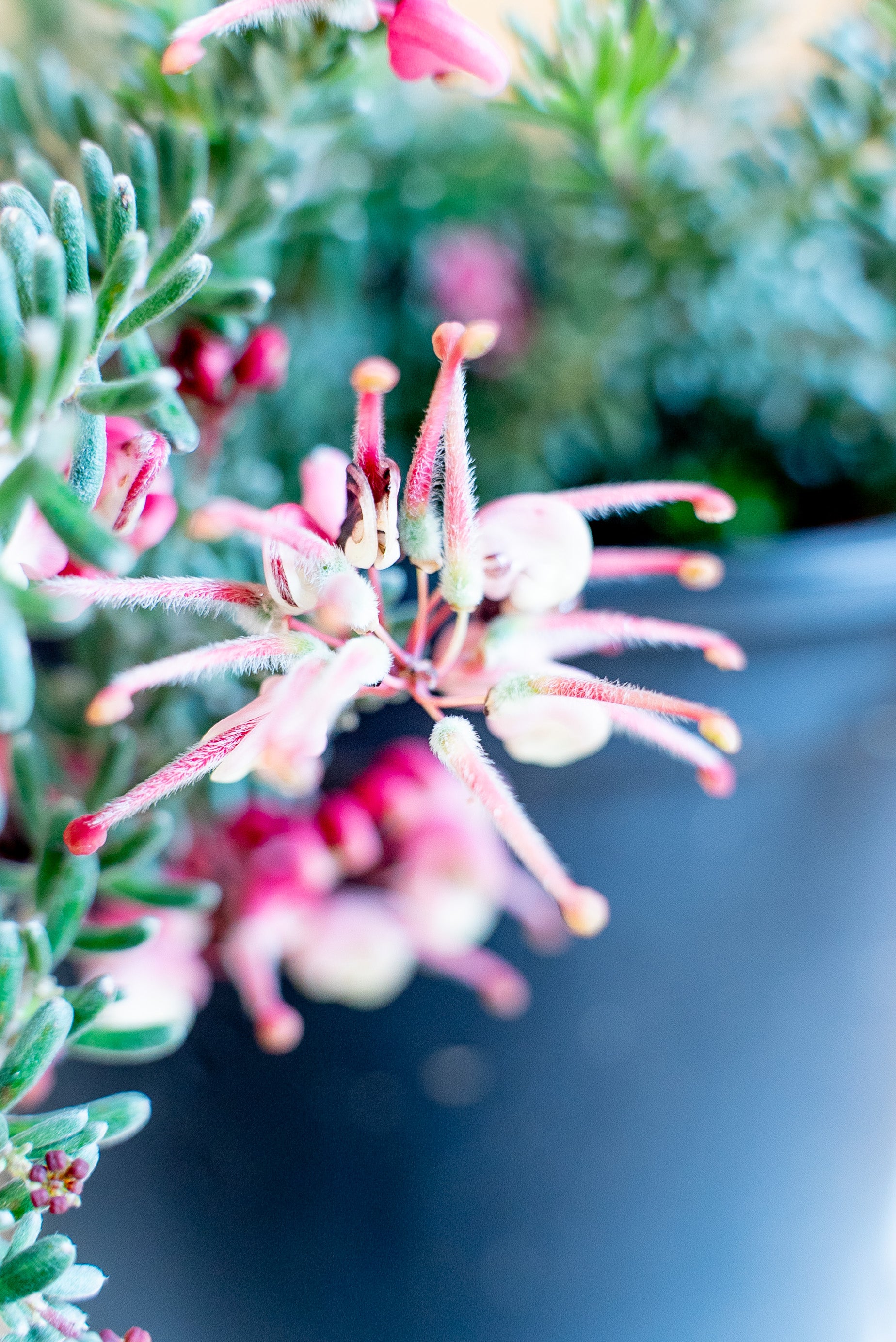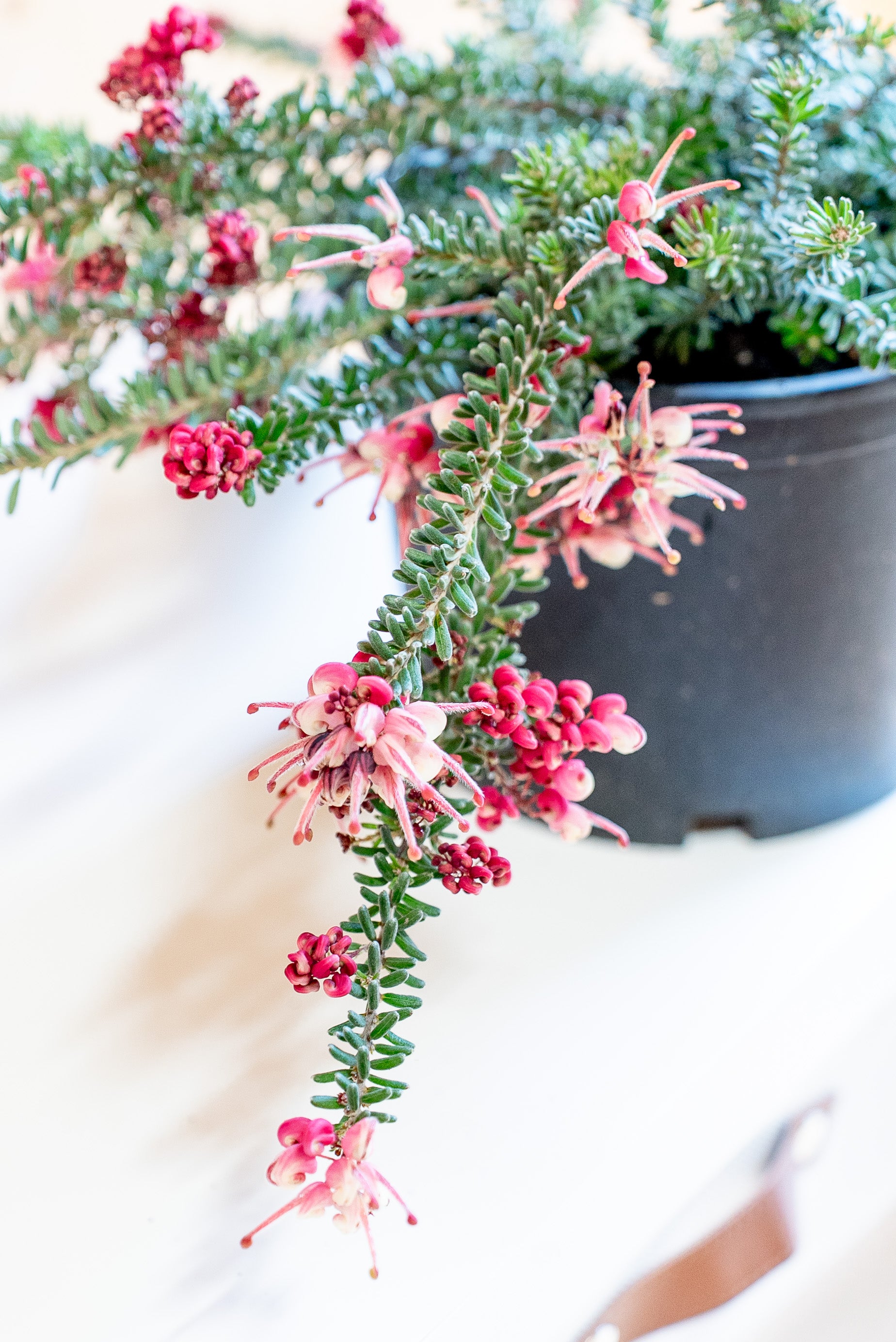 La Grevillea Tamboritha è un arbusto sempreverde a crescita bassa e compatta, con un portamento tappezzante che può raggiungere un'altezza di 30-50 cm e una larghezza di circa 1 metro. Le sue foglie sono sottili, aghiformi e di un verde intenso, ricordando quelle di alcune conifere. I fiori, il vero punto di forza della pianta, sono di un intenso colore rosso-arancio, con sfumature rosa e giallo. La loro forma caratteristica, simile a piccoli pennelli, attira api, farfalle e uccelli nettarivori, contribuendo all’ecosistema del giardino.