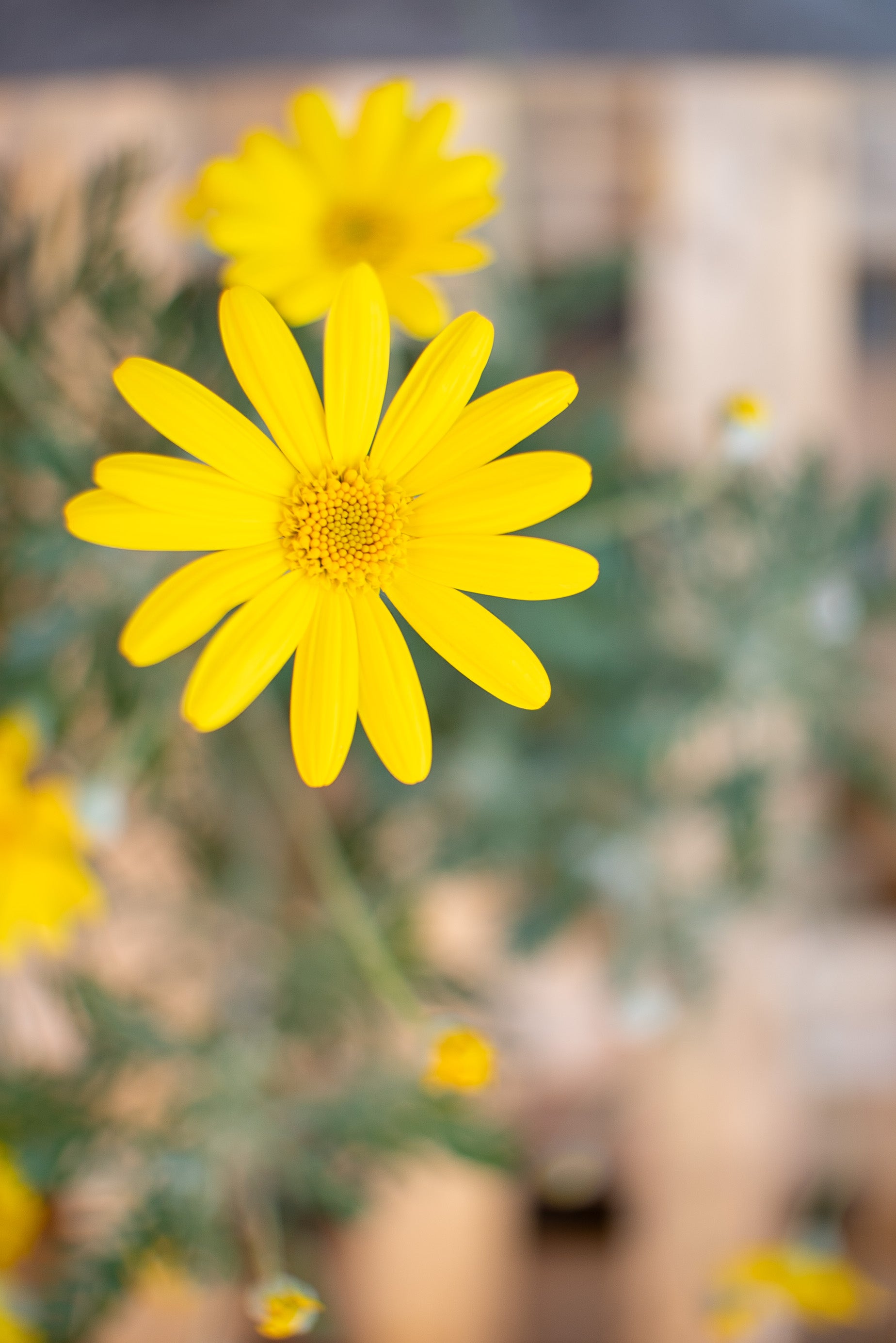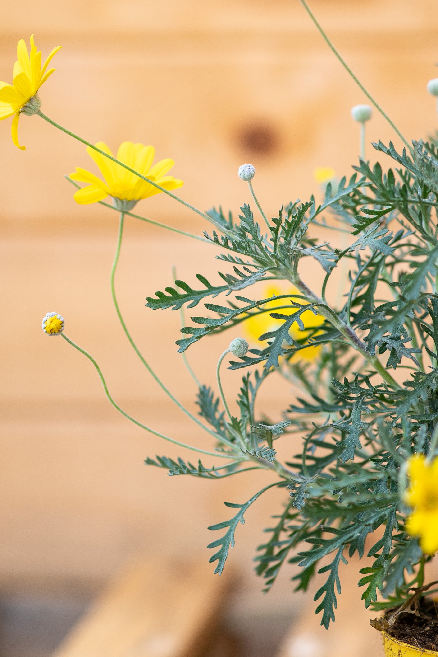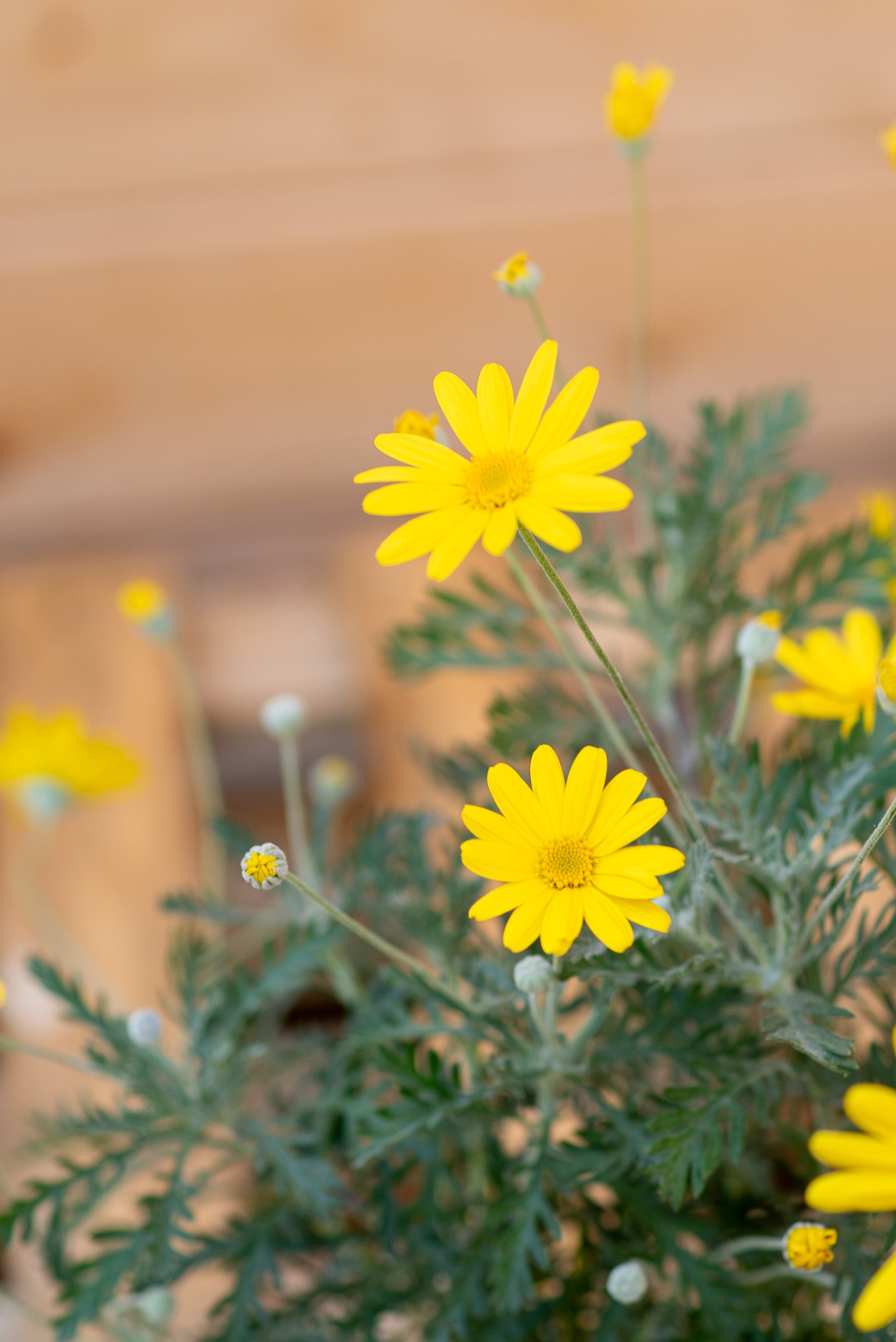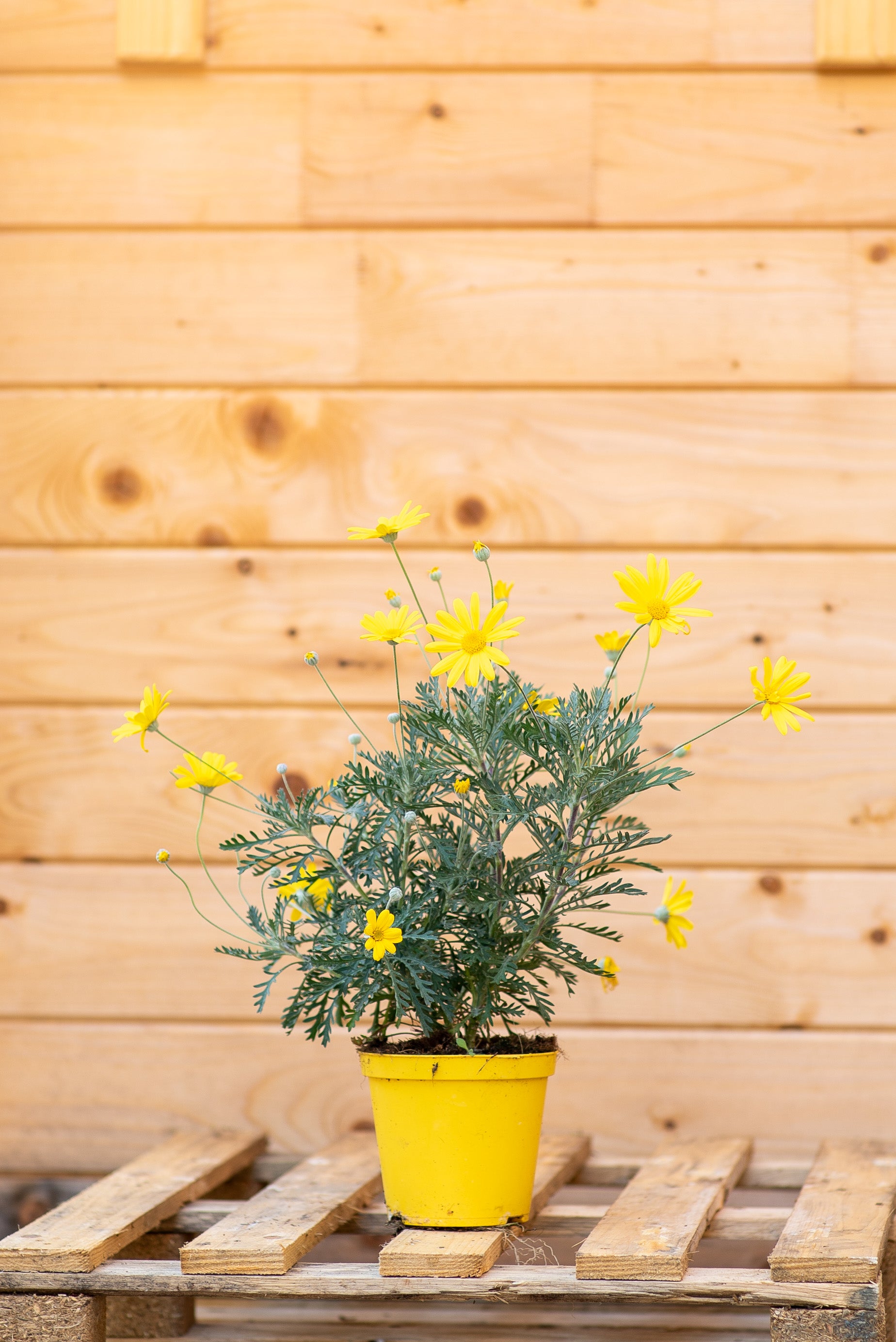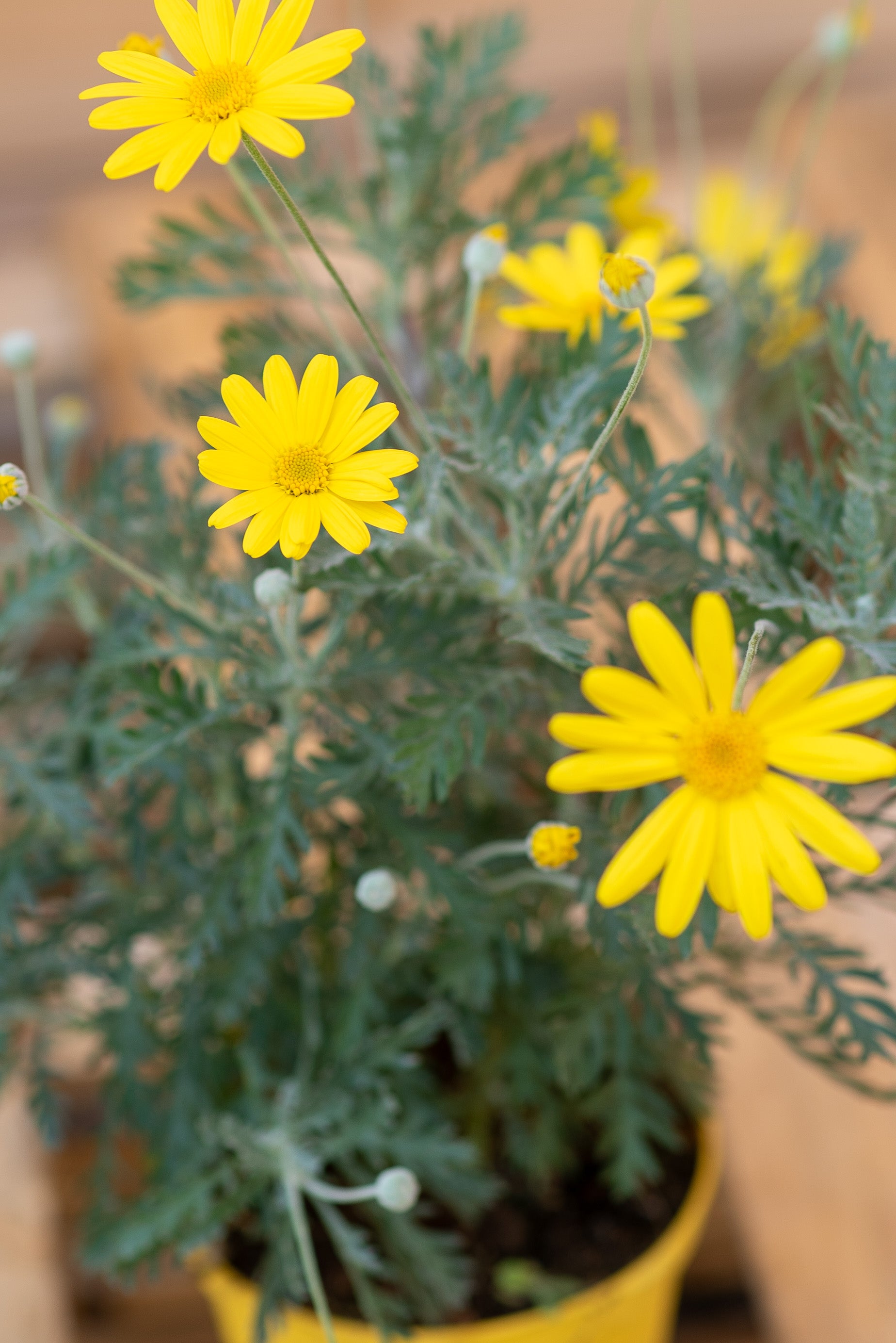La margherita gialla (Euryops pectinatus) è originaria del Sudafrica. Si è diffusa nei giardini di tutto il mondo per la sua capacità di fiorire a lungo e il suo colore solare, che porta allegria.