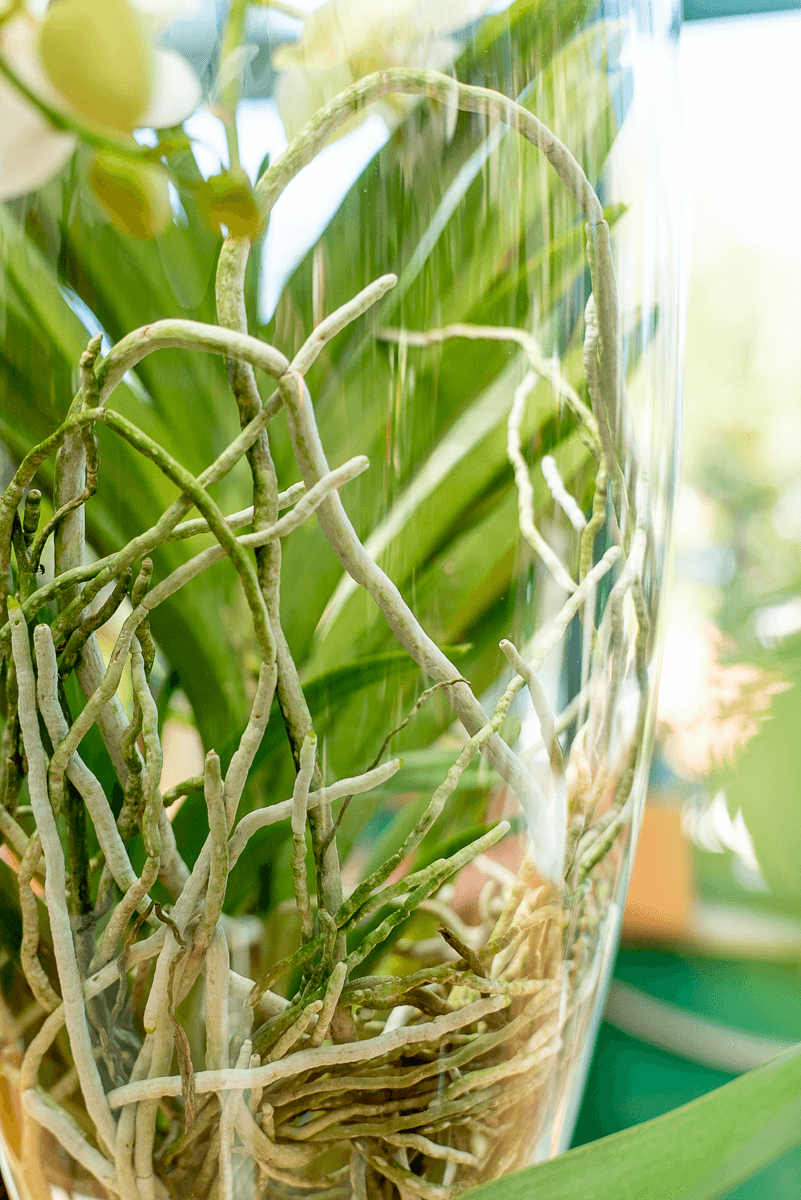 La Vanda è una delle poche orchidee in grado di fotosintetizzare attraverso le radici, che devono restare libere e visibili.