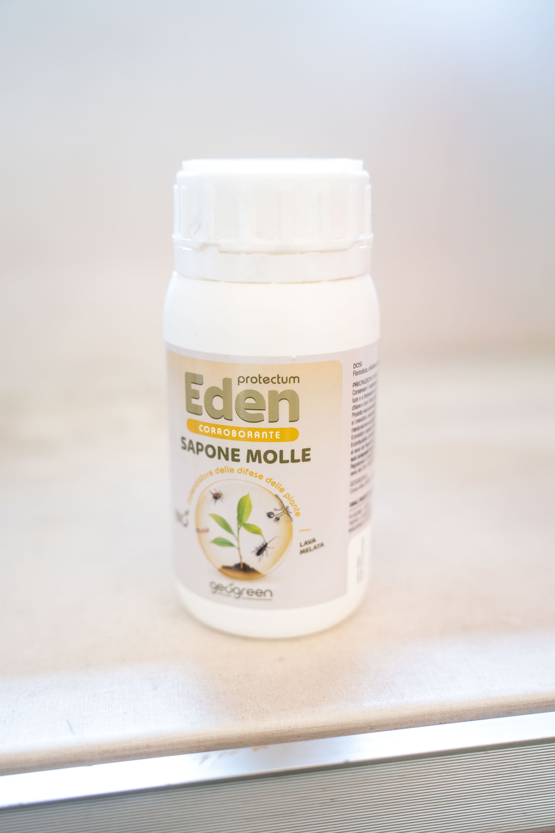 Caratteristiche: Eden Protectum SAPONE MOLLE è ottenuto dalla trasformazione di oli vegetali (escluso l’olio di palma) ad alto contenuto di acidi grassi insaturi. Completamente biodegradabile, idrosolubile e privo di fitotossicità. L'azione del sapone molle migliora la resistenza della pianta agli stress causati da fitofagi che producono melata, come Psille, Metcalfa, Mosche bianche, Cocciniglie cotonose, Afidi, ecc. Pulisce la vegetazione dagli imbrattamenti causati dagli insetti, prevenendo lo sviluppo di patogeni secondari come le fumaggini, che possono provocare l'annerimento delle foglie e limitare la fotosintesi. Ha un'ottima azione fitoprotettiva verso gli insetti, specialmente quelli a corpo molle.