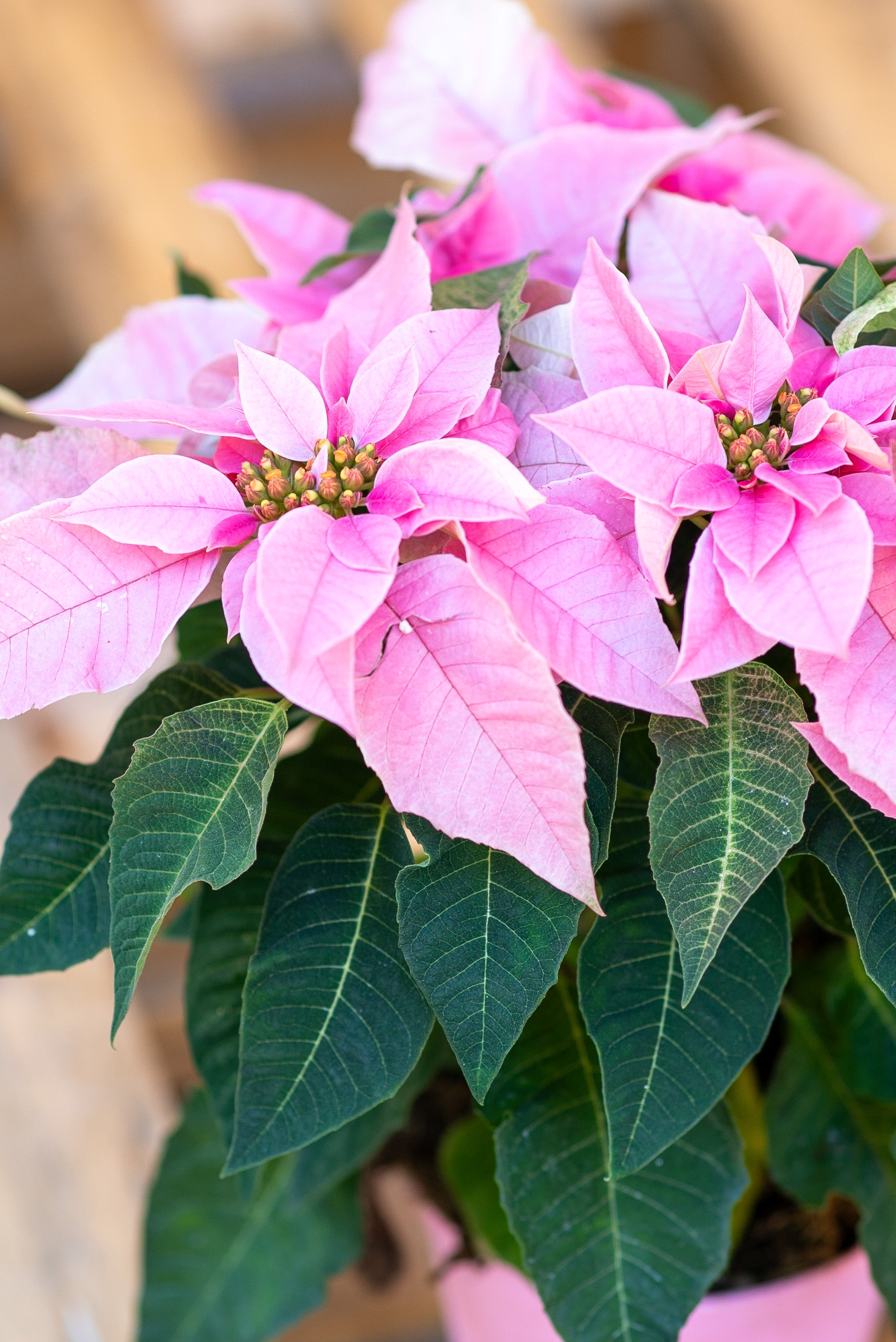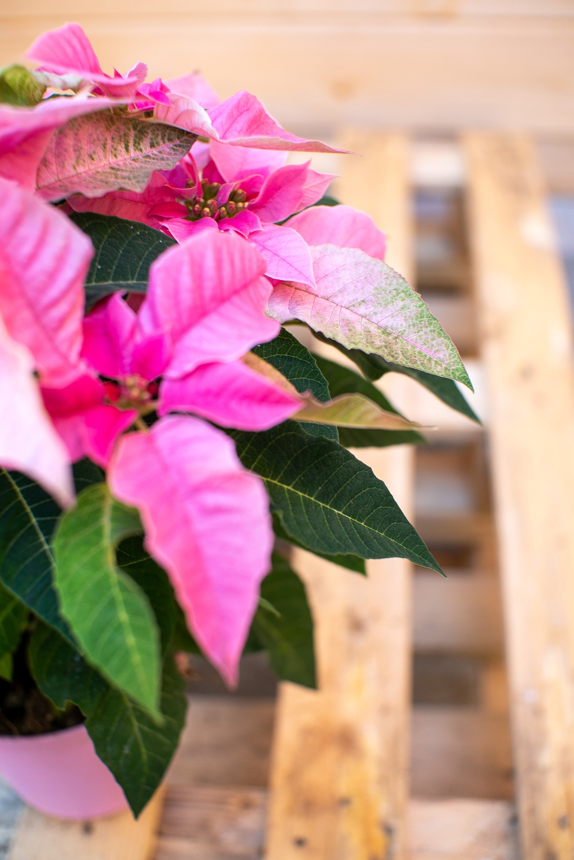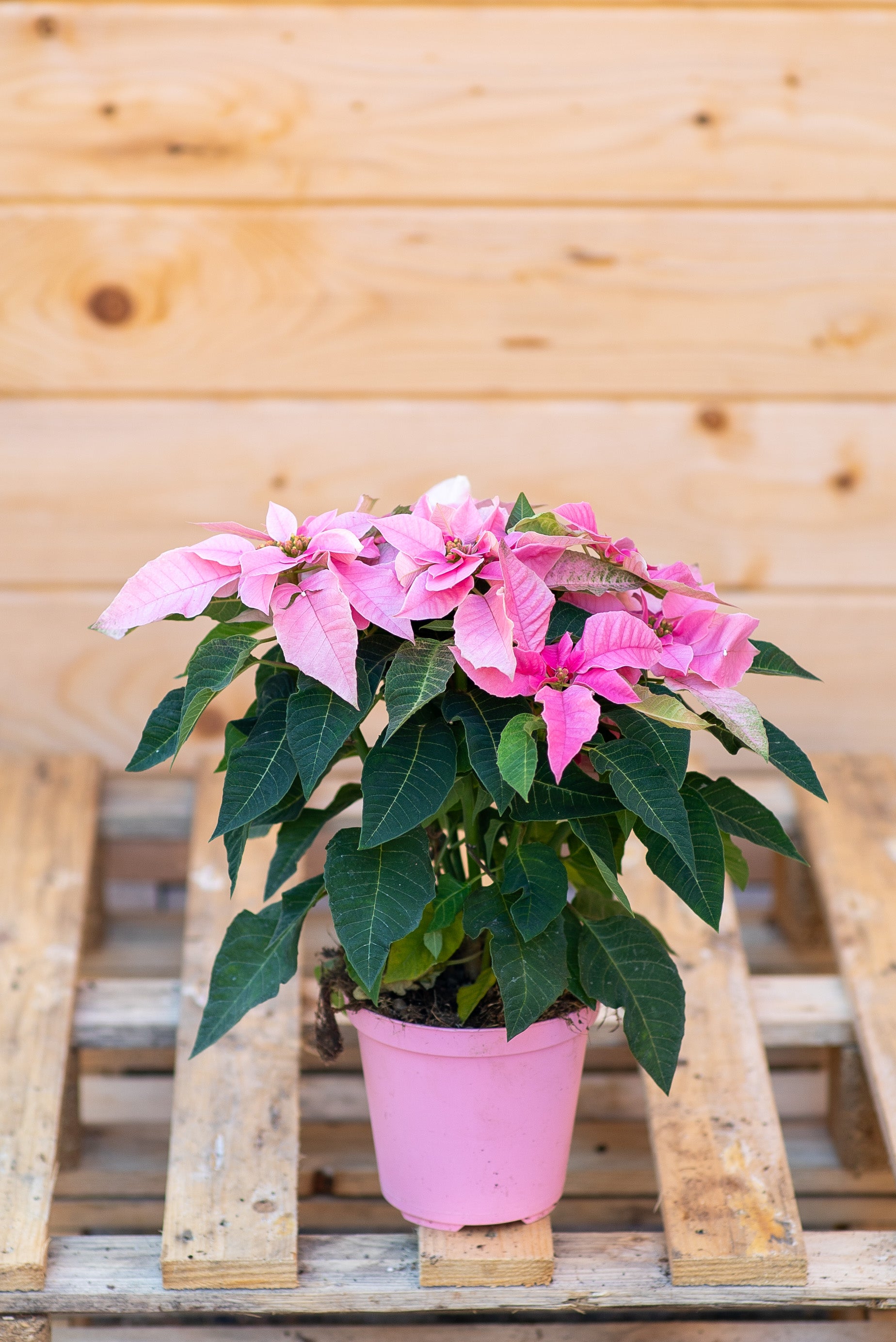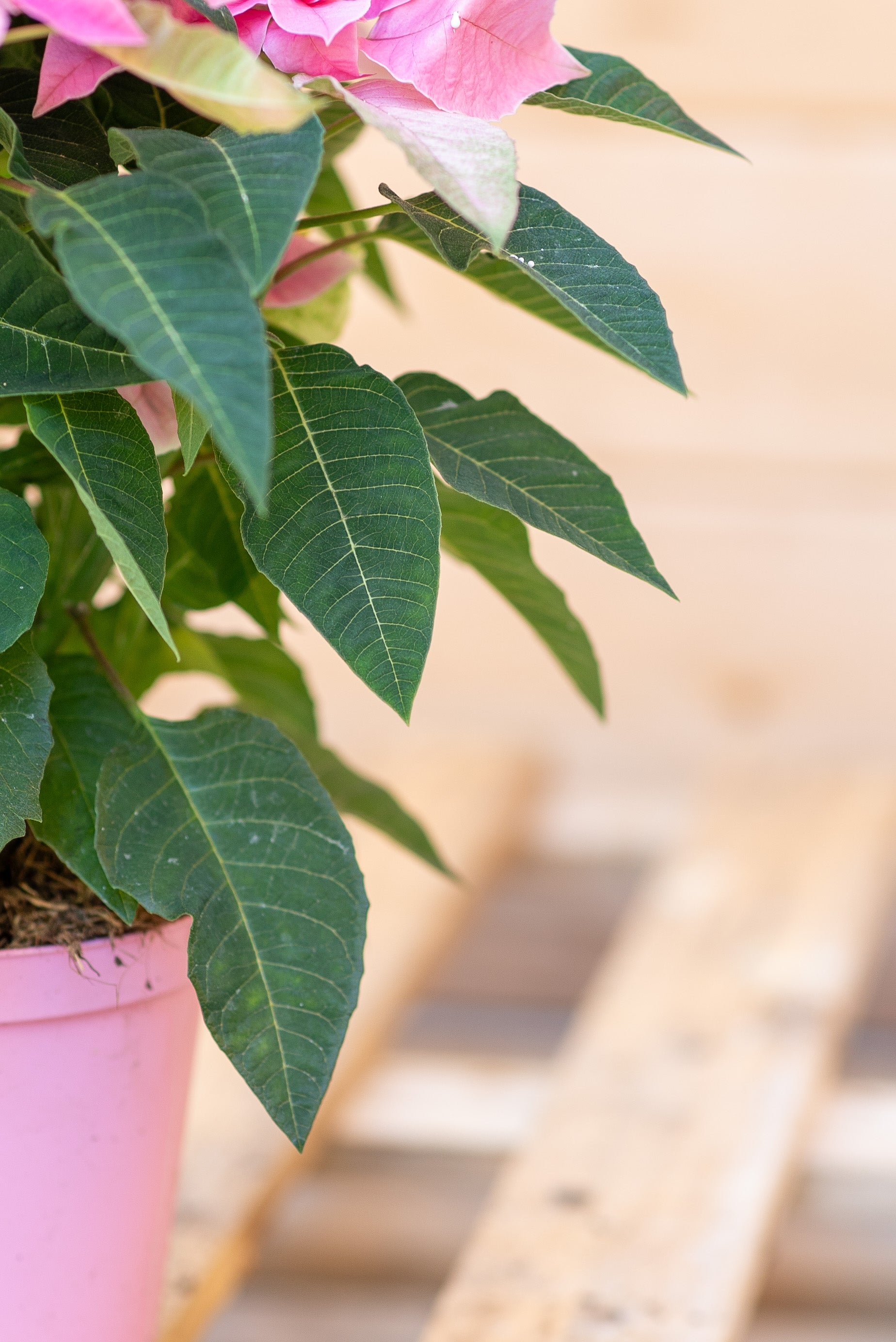 Ha brattee colorate, dal rosa tenue al fucsia intenso, che durano a lungo. Le foglie verdi fanno da contrasto, creando un effetto decorativo. È ideale per abbellire interni durante le feste.